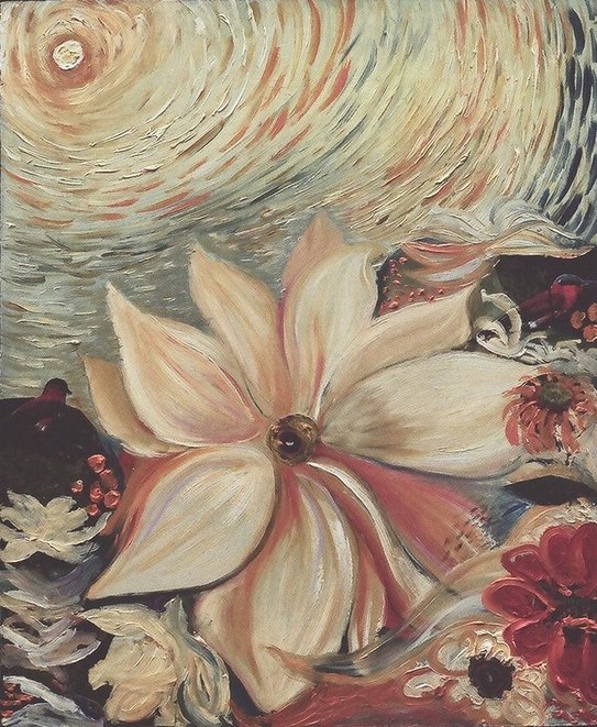 ‘Beautiful white flower basking in the early morning sun’,1993,oil-collage,0.3 mtrs,SOLD