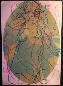 ‘Techno Goddess’ 2019 / felt pen life drawing over photo print out of fabric work ‘Techno Dancer’ 2017 / 40cm / $250