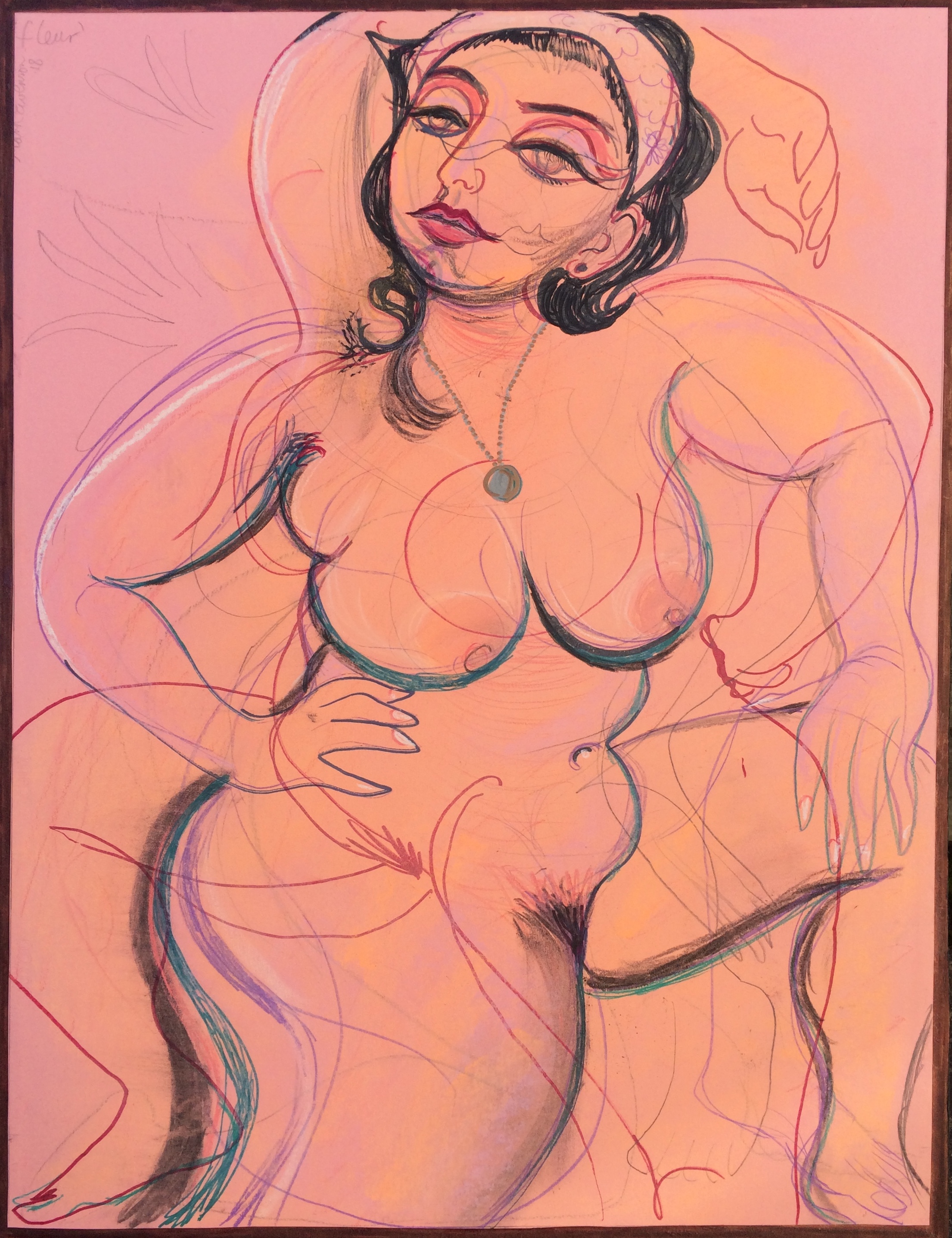 ‘Fleur @Stkilda drawing 2018 / 42x55cm / pastel, felt pen, pencil, charcoal, gel pen on pink card / $400 ready to hang