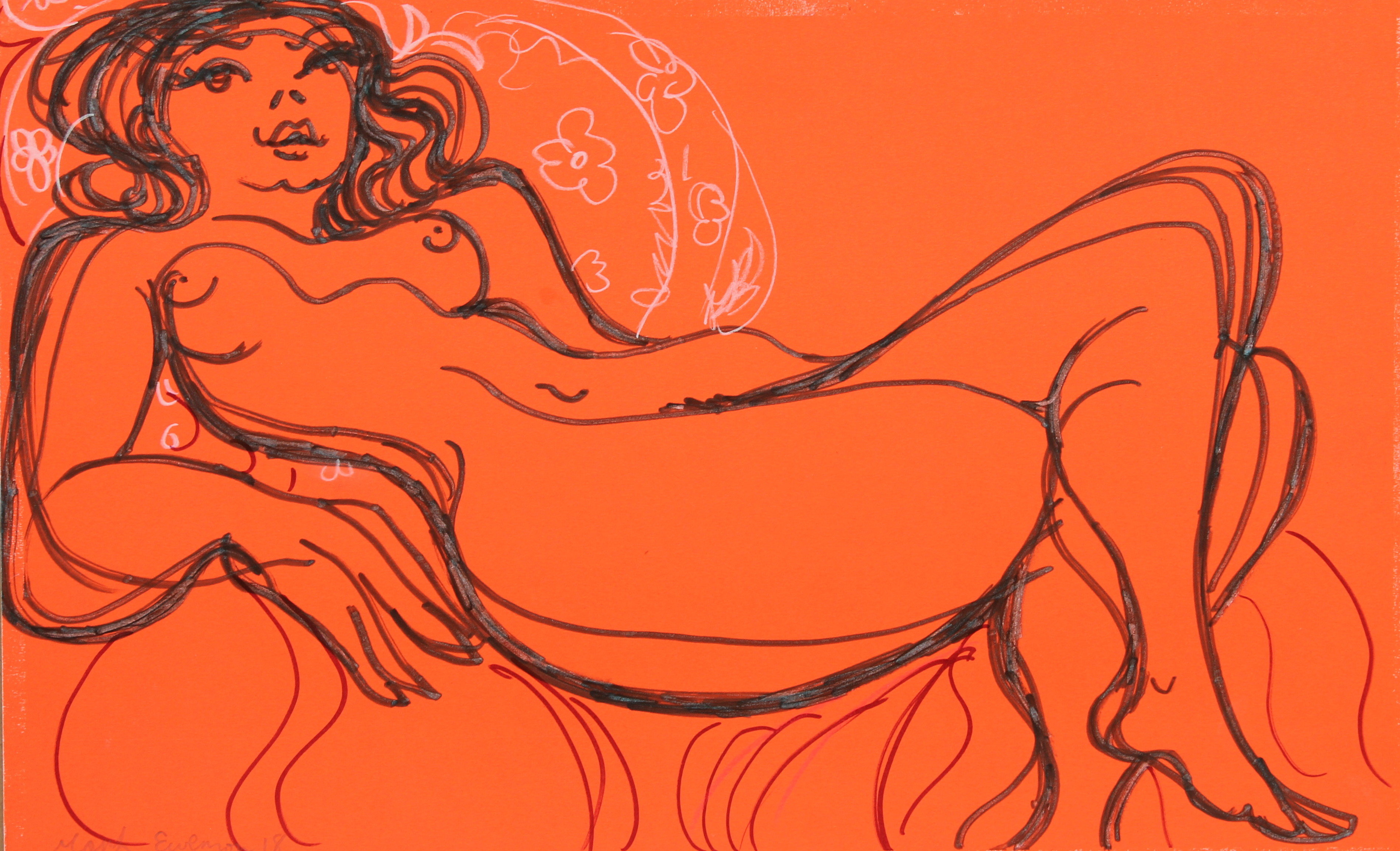 ‘Woman in orange 2’ / 2017 / felt pens, pencil on orange paper / 0.4 metres