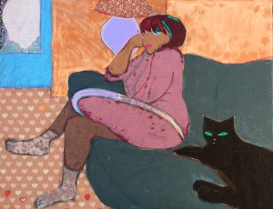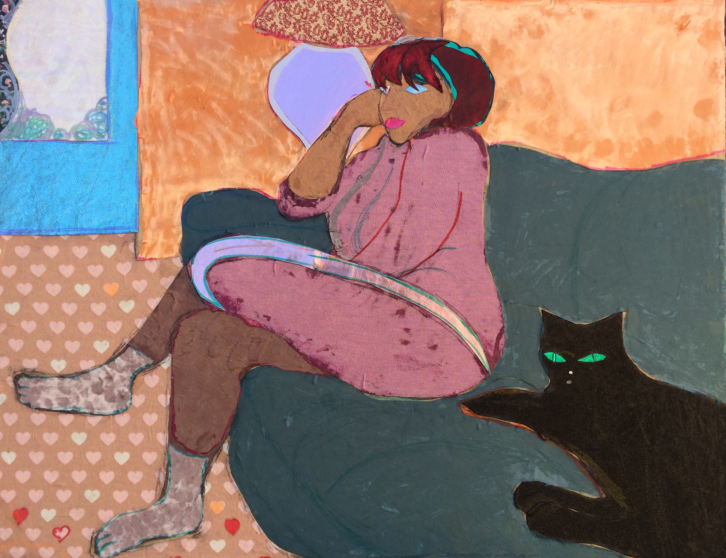 ‘Cat Woman’ 2019-20 / layered fabrics, pva glue, felt pen, gel ink pen, pencil, photography on mdf / 0.5 metres / $750 $750 BUY NOW ONLINE!…CLICK LINK BELOW ART WORK