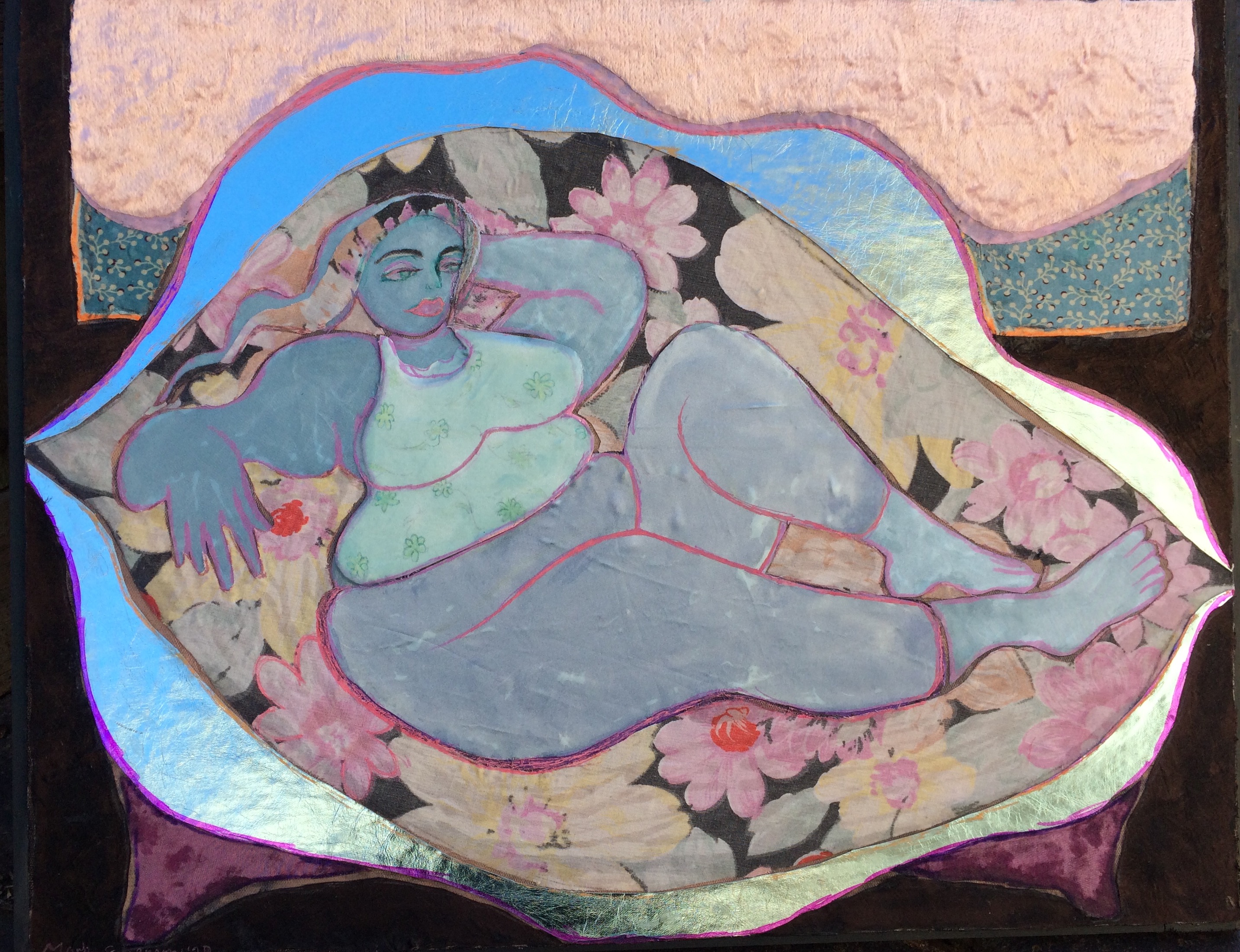 ‘Goddess Positive’ 2019-20 / layered fabrics, pva glue, felt pen, gel ink pen, pencil. / 0.5 metres / $650 $750 BUY ONLINE NOW!…CLICK LINK BELOW ARTWORK