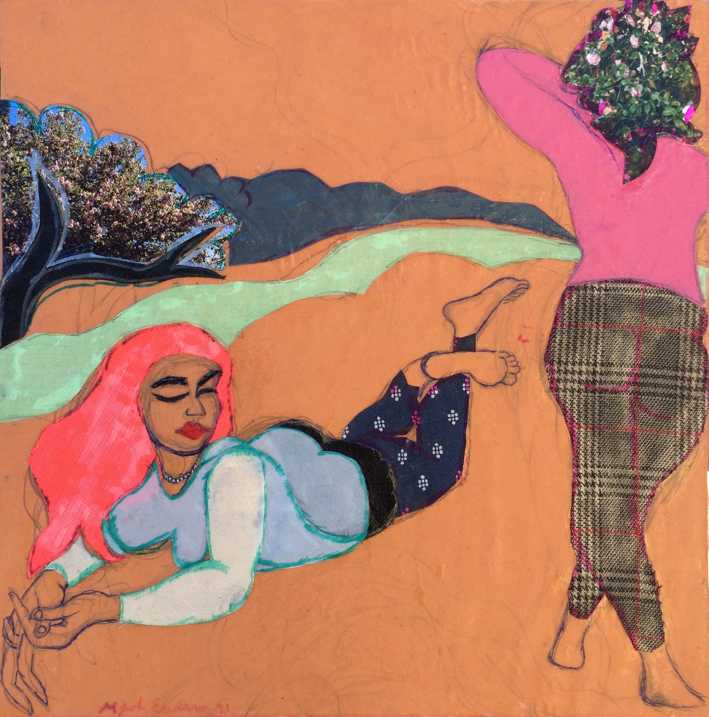 Sunshine, 2021, fabrics, pva glue, photography, mixed media drawing on panel / 32x32cm