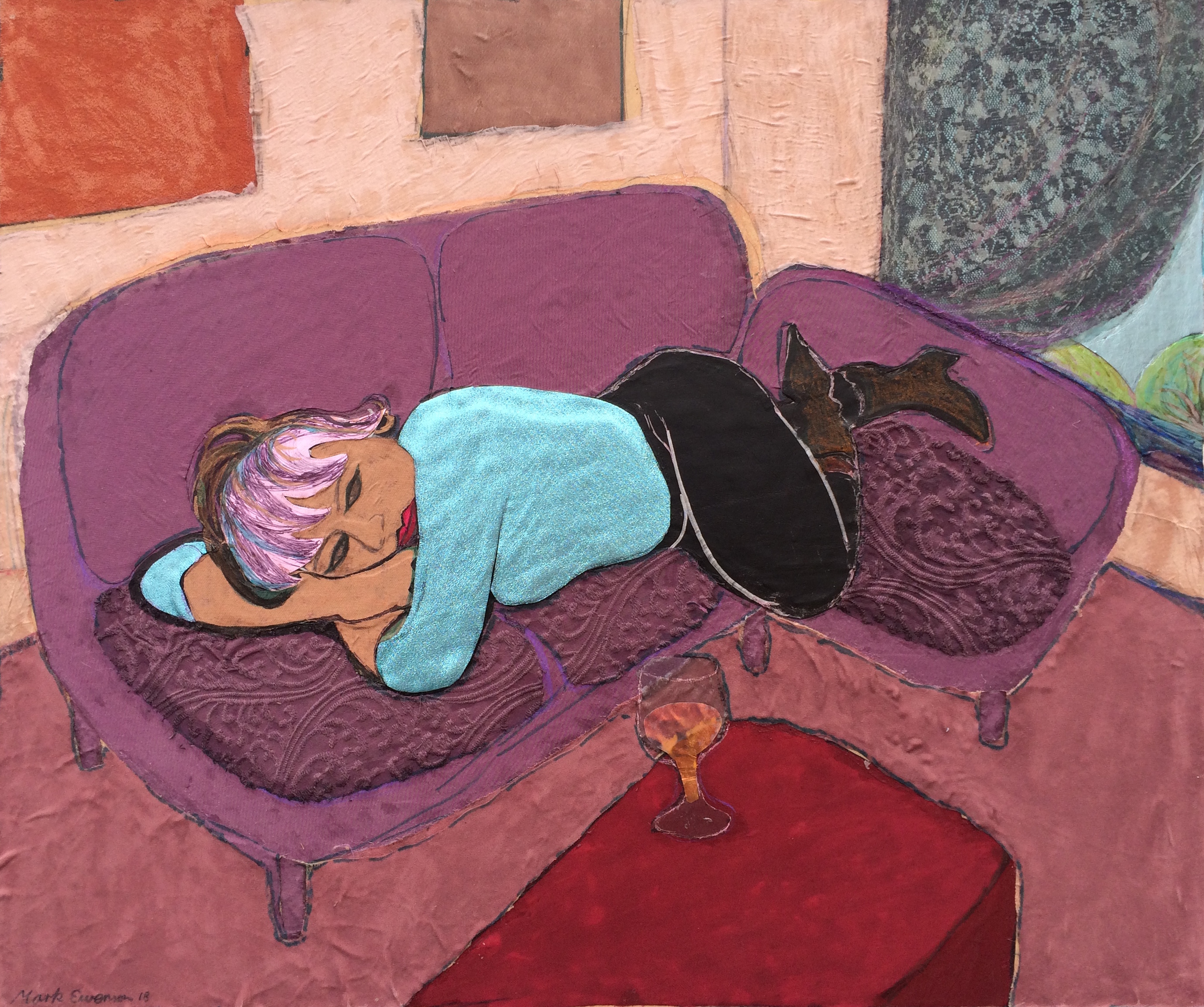 ‘Woman with a glass of wine’ 2018-19 / layered fabrics, PVA glue, felt pens, pencil / 60×50.5 cm / $950 $950 BUY NOW ONLINE!….CLICK LINK BELOW ART WORK