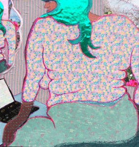 ‘Iso Woman’ 2020 / 56x59cm / layered fabrics, pva glue, photography, felt pen, gel pen on panel / $1500 $1000 BUY NOW ONLINE!…CLICK LINK BELOW ARTWORK