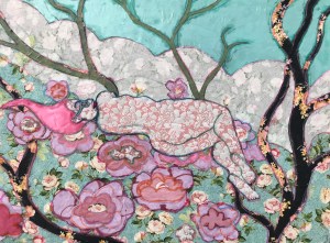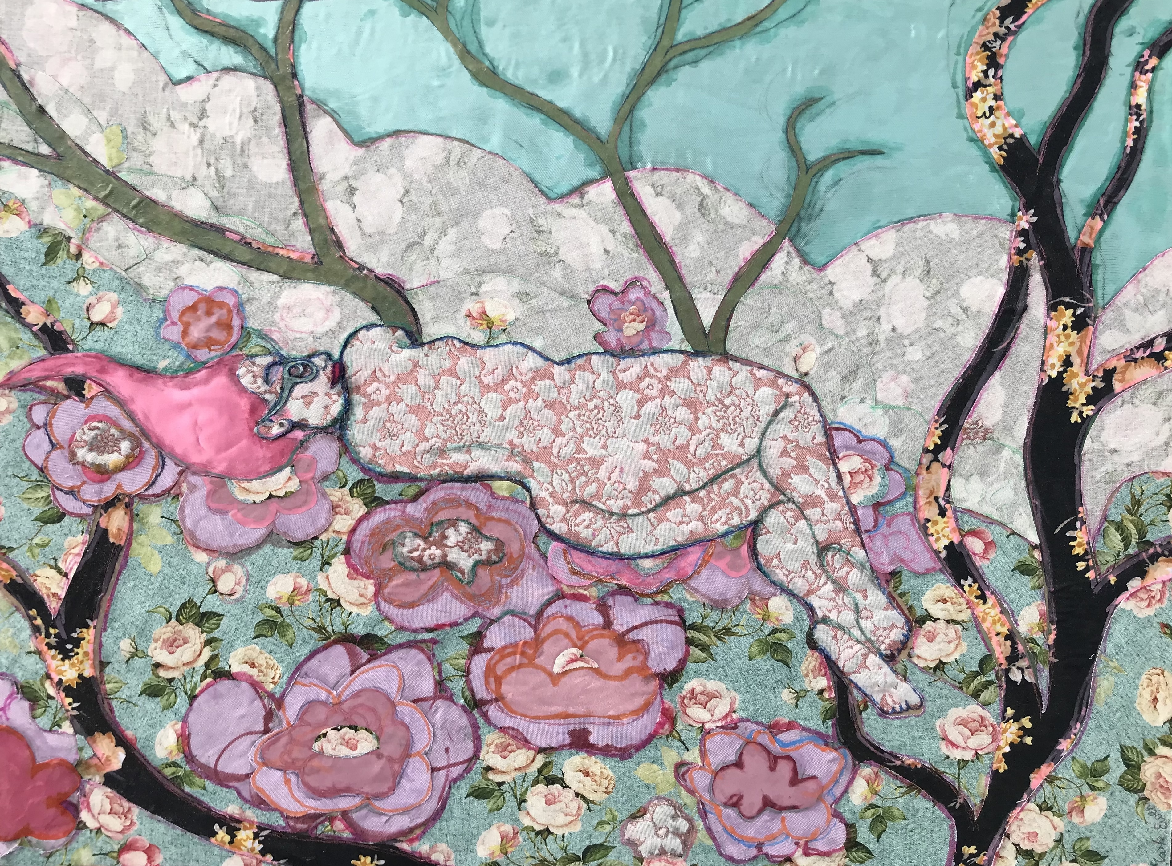 ‘Woman in Bush Garden’ Woman In Bush Garden, 2022, fabrics, pva glue, mixed media drwing on mdf / 46x61cm