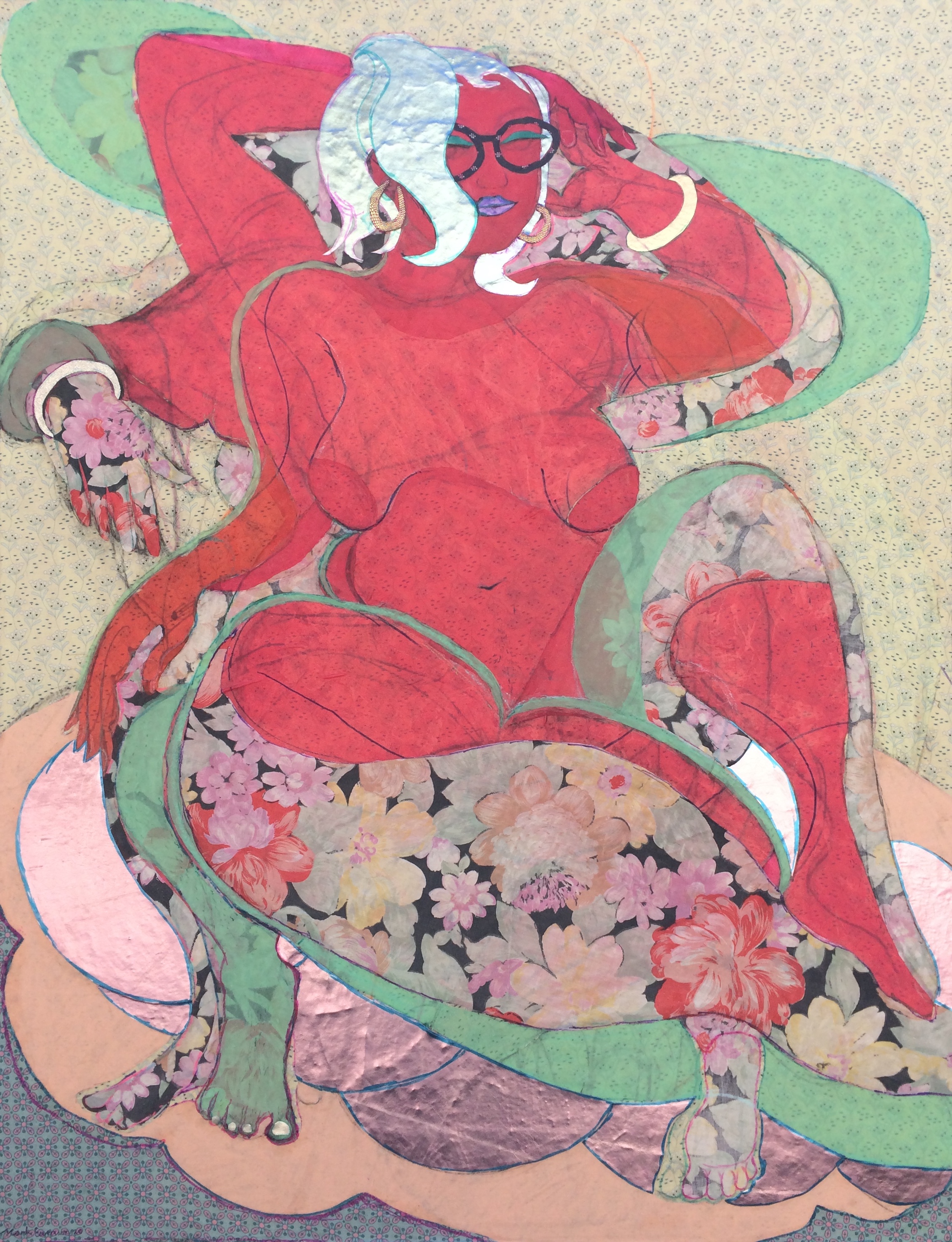 Red Goddess ‘Red Goddess’ 2020 / 100x130cm / layered fabircs, pvas glue, felt pen, charcoal on panel / $5000