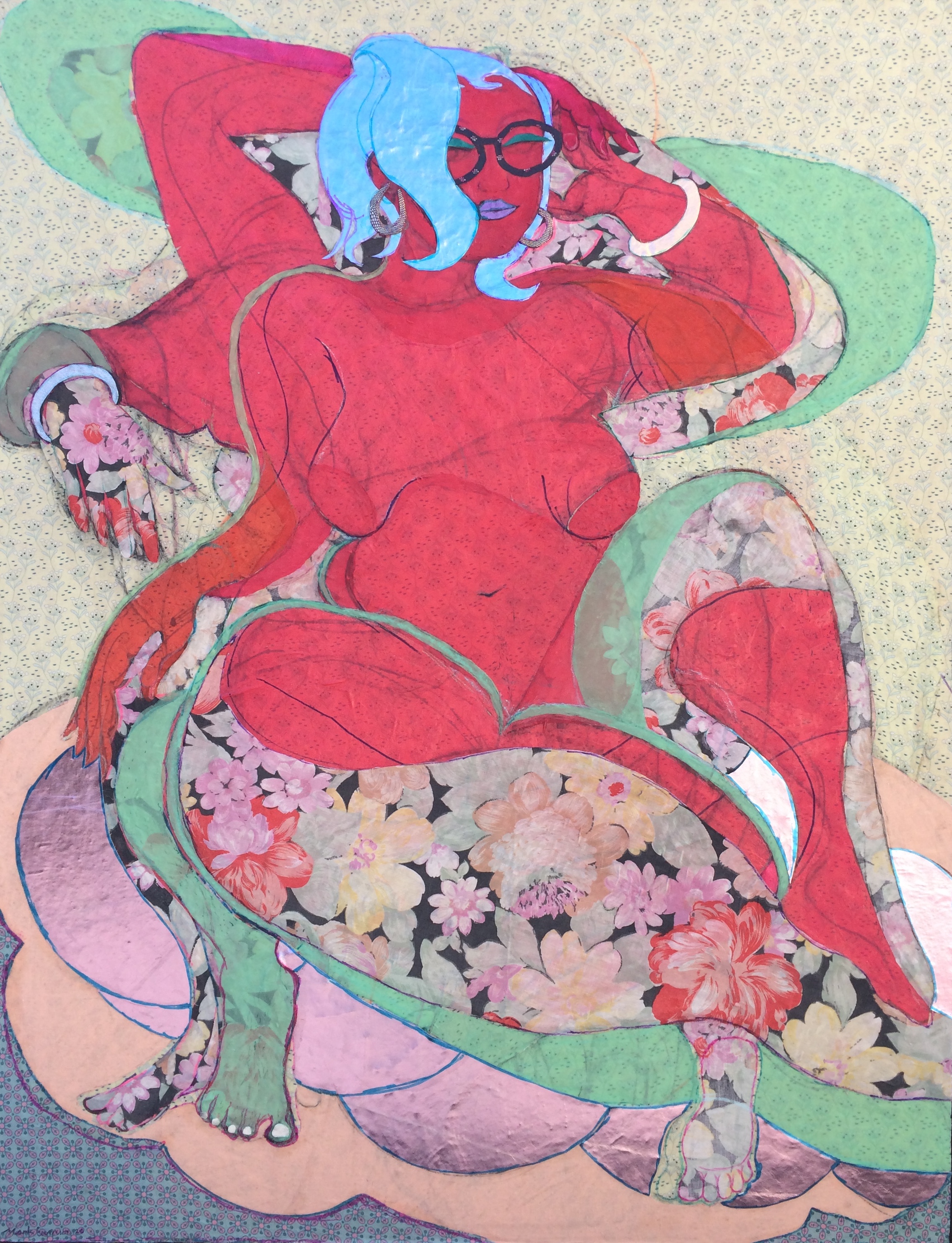 ‘Red Goddess’ 2020 / 100x130cm / layered fabrics, pva glue, felt pen charcoal on panel / $5000